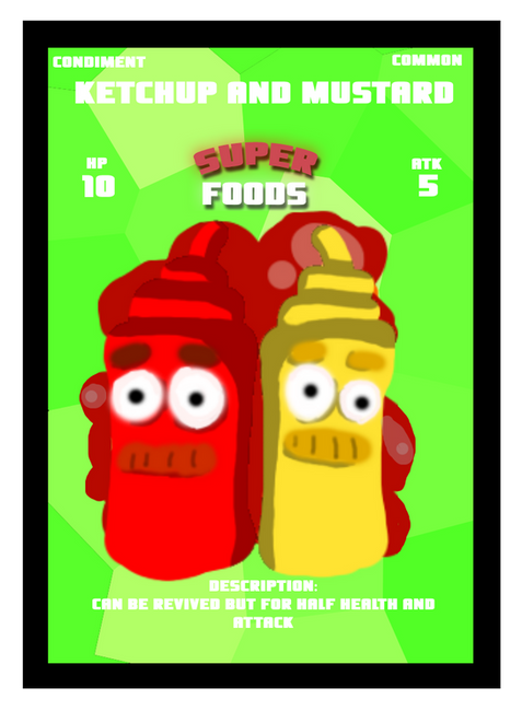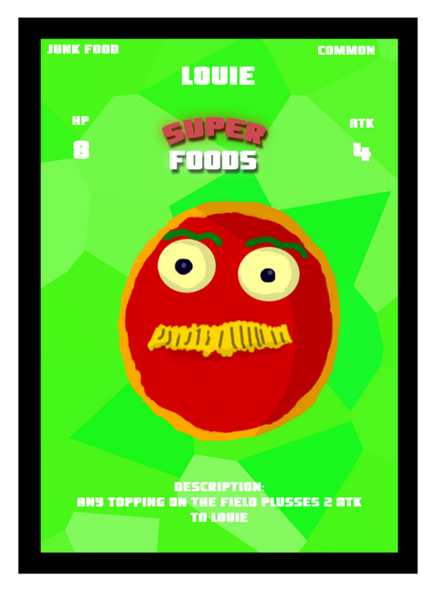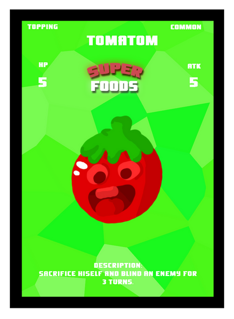 Super Foods is a TCG (Trading Card Game) in which you collect cards build decks and battle friends. You can buy packs off of our store at . The rules of this game are simple you place you deck/cards available and pick the top card and place in the battle grounds your enemy will do the same. If for example your cards HP is 5 and your ATK is 5 but your enemy has double your stats your card would be out but the enemy's card is down 5 hp